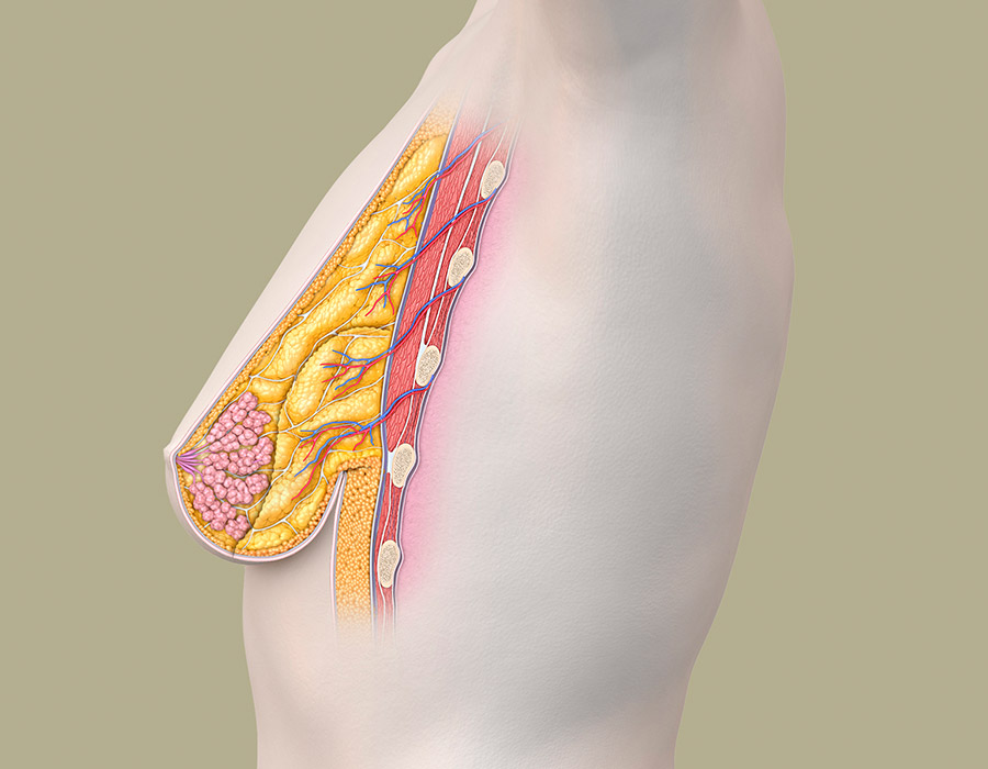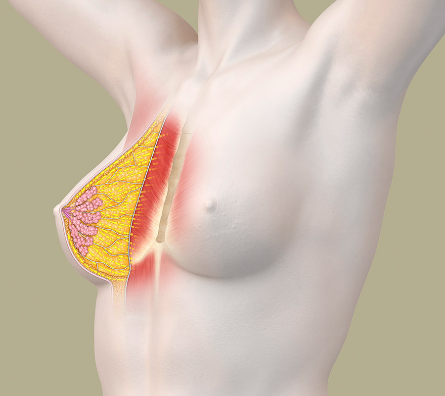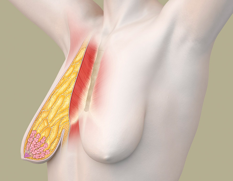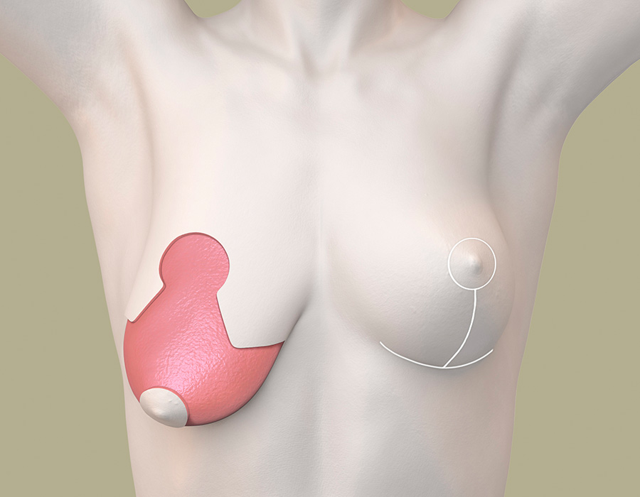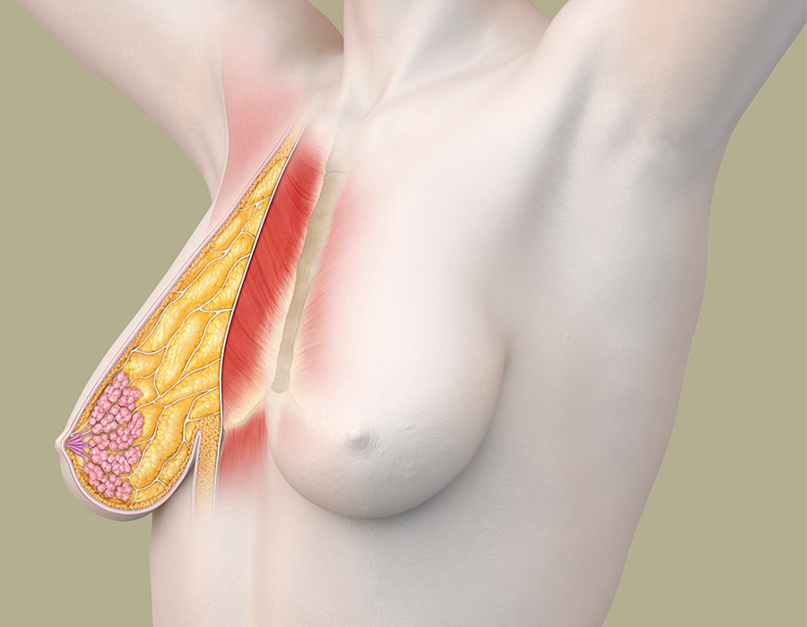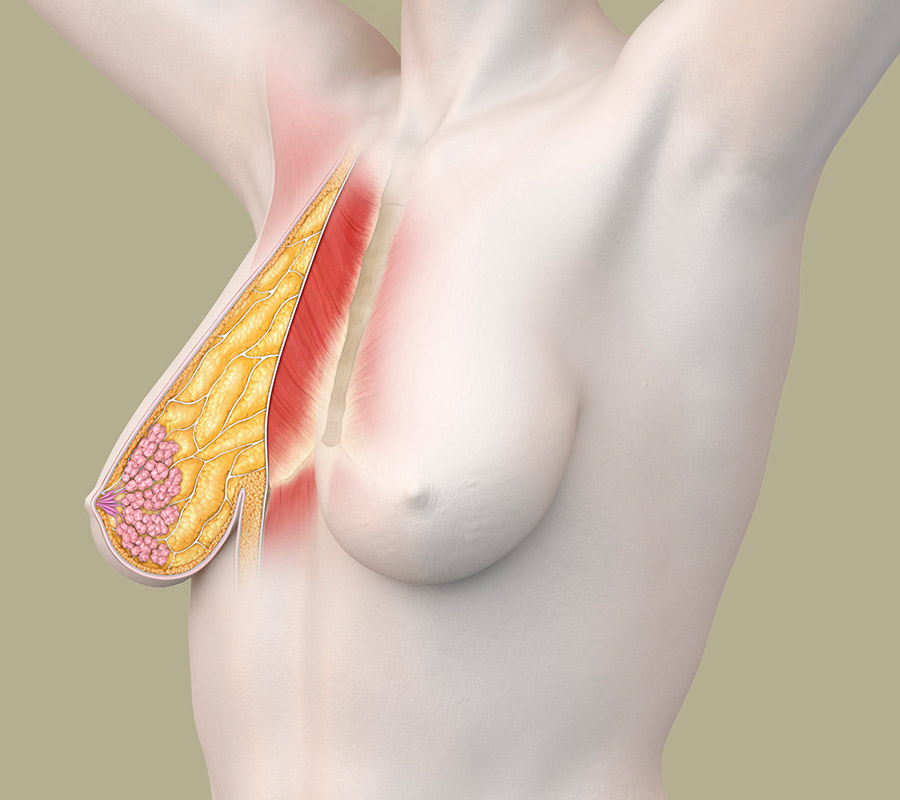 Abb 3a: Die segmentale Gefässanatomie der Brust erlaubt es das hängende Gewebe im unteren Bereich mit seiner Blutversorgung vom oberen Brustgewebe zu trennen. Erkennbar an der S-förmigen Kontur beginnend am Gewebe der Brustdrüse (rosa) und auslaufend am Brustmuskel (rot).