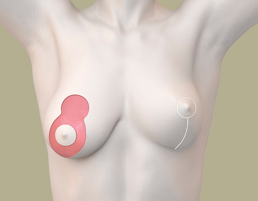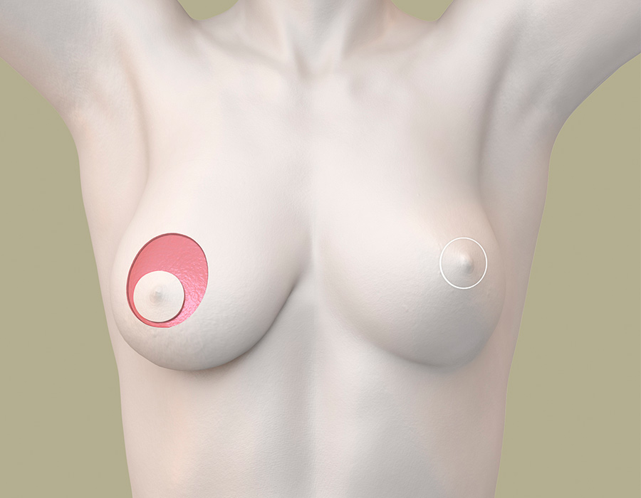 Abb. 4c: Bei der Bruststraffung mit O-förmiger Narbe wird die überschüssige Haut kreisförmig entfernt (links) und die Brustwarze auf dem Drüsengewebe in ihre neue Position angehoben, woraus einen zirkulärer Narbenverlauf um die Brustwarze resultiert (weiße Linie rechts), weshalb dies Methode auch O-Schnitt genannt wird.